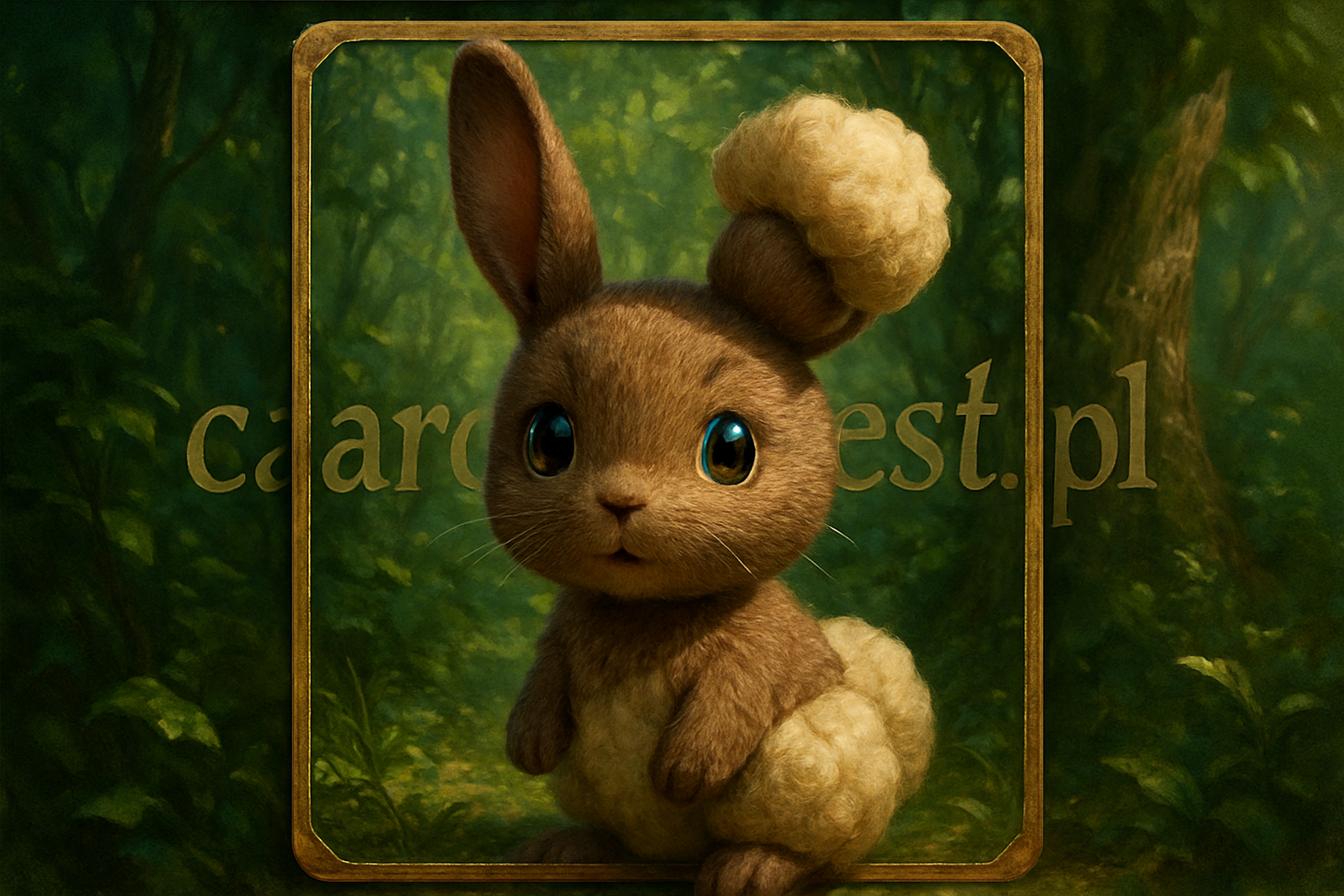 uroczy, puszysty pokemon Buneary w bujnym zielonym lesie, z jednym uchem zwiniętym w kłębek, patrzący z ciekawością w obiektyw, fotorealistyczny, bardzo szczegółowy.