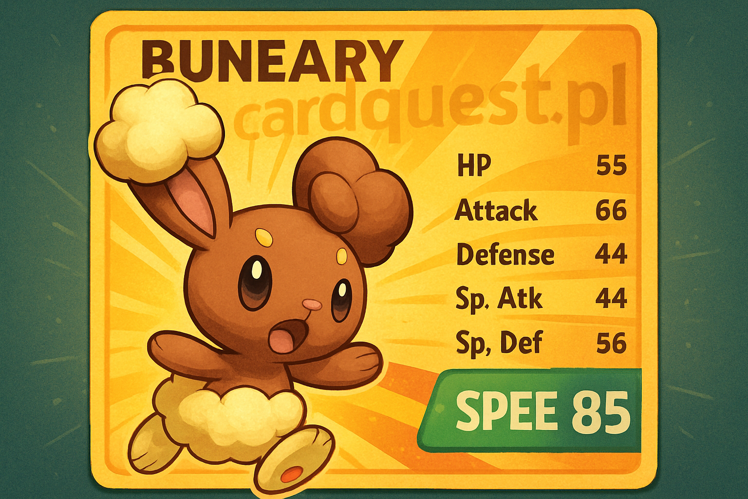 Zastanawiasz się, jakie są bazowe stats Buneary i jak się je interpretuje? Te stats odzwierciedlają naturę tego Pokémona jako szybkiego, ale delikatnego stworzenia. Największym atutem Buneary jest Szybkość, pozwalająca mu atakować jako pierwszy. Pozostałe stats są stosunkowo niskie, co jest typowe dla nieewoluowanego Pokémona. Atak tego Buneary jest przyzwoity, co czyni go zdolnym do zadawania obrażeń. Niskie stats obronne sprawiają, że Buneary jest podatny na silne ciosy. Pełne bazowe stats to: HP: 55, Atak: 66, Obrona: 44, Atak Specjalny: 44, Obrona Specjalna: 56, Szybkość: 85.
