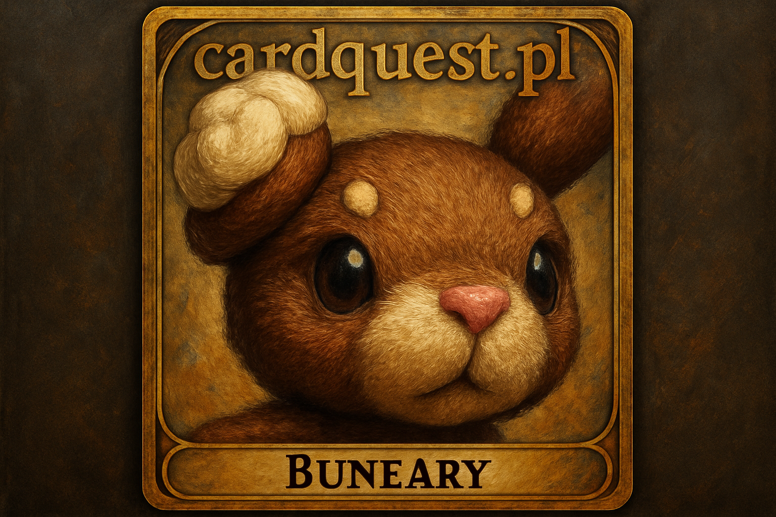 szczegółowe makrofotografia twarzy pokemona Buneary, podkreślająca fakturę jego brązowego i kremowego futra, różowy trójkątny nos oraz charakterystyczne zwinięte ucho.