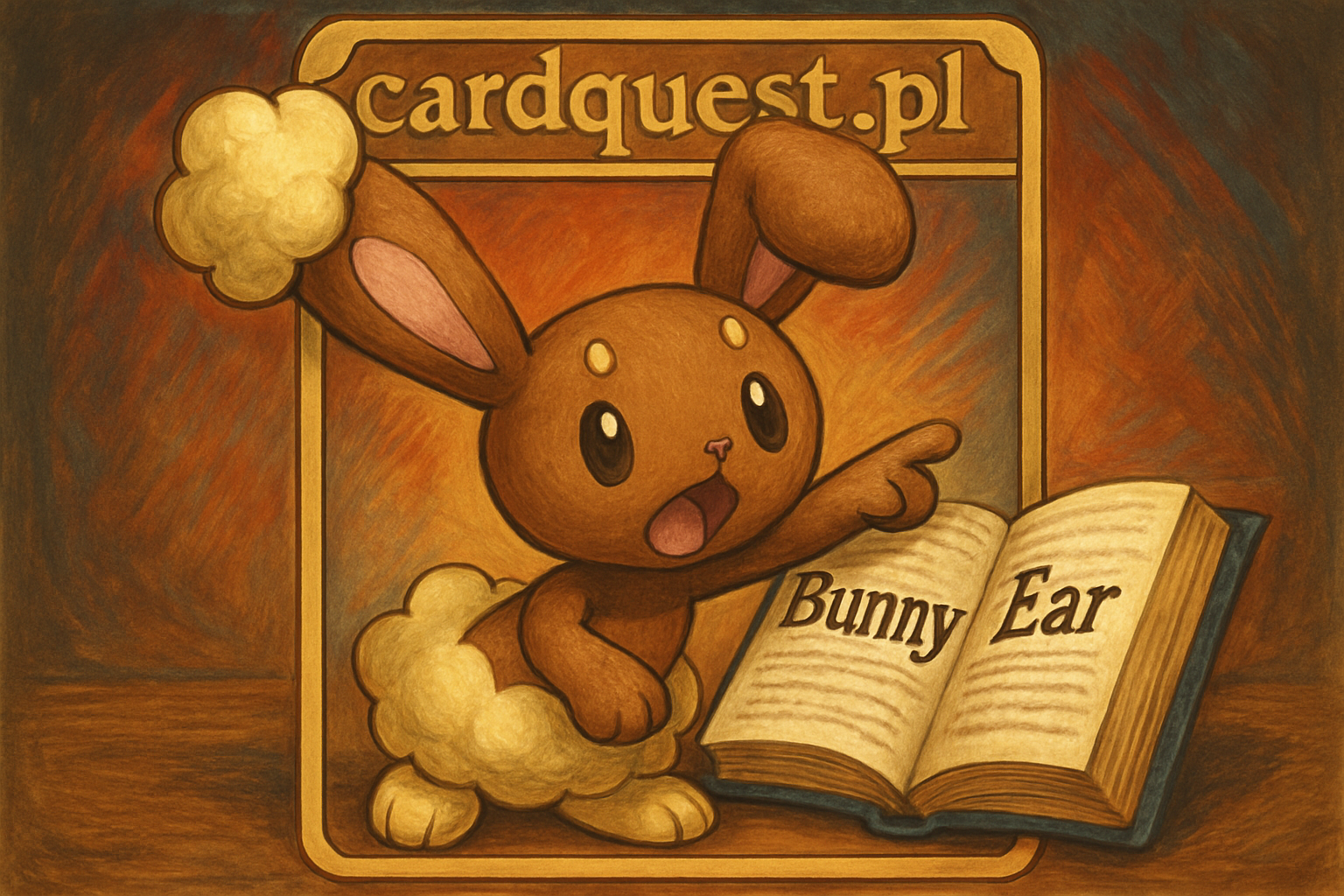 kapryśny, edukacyjny obrazek przedstawiający pokemona Buneary wskazującego na słowa 'Króliczek’ i 'Ucho’ w otwartym słowniku, ilustrujący pochodzenie jego nazwy.
